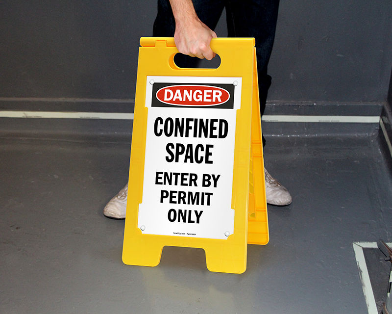 • • Use a Stand-up Floor Sign to prevent unauthorized personnel from entering confined spaces. Or, place a message on the ground with our adhesive Confined Space Floor Sign.