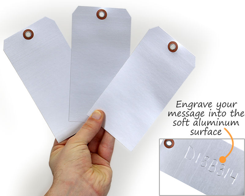 Metal Tags are hand engravable. Permanently deboss your message into these annealed aluminum tags, creating an indelible message.