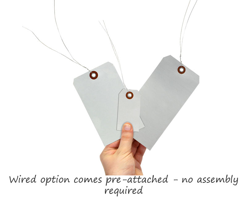 Alternatively, you may order tag strings, wires, and ties separately from our Tag Accessories page. Choose from regular and stainless steel wires, regular, waxed and elastic strings, and nylon locking ties.