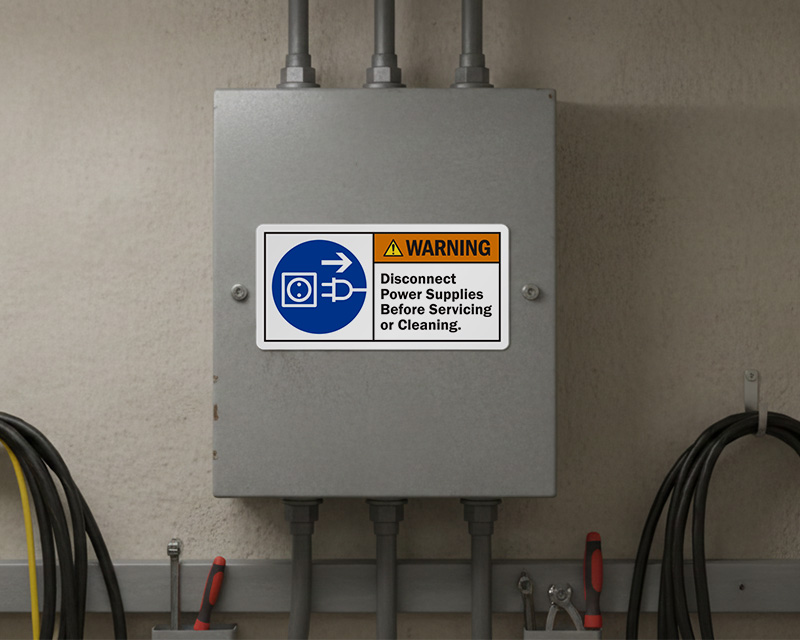 Electrical Disconnect Labels identify power isolation points, shut-off locations, and disconnecting means for electrical equipment. These labels help improve visibility during servicing, maintenance, and emergency situations by clearly marking where electrical power can be safely disconnected. Ideal for panels, machinery, control boxes, and industrial electrical systems.