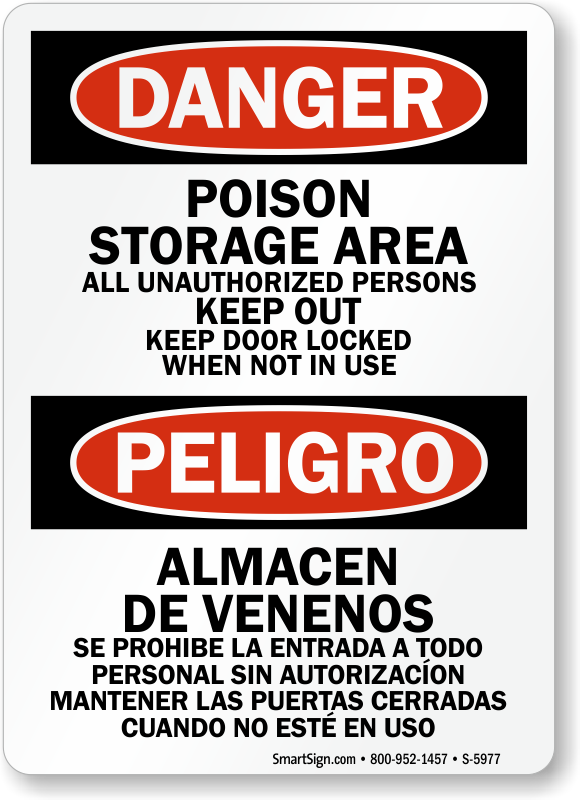 Bilingual OSHA Danger / Peligro Sign: Poison Storage Area - All Unauthorized Persons Keep Out Keep Doors Locked When Not In Use