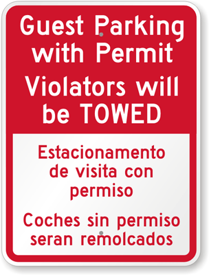 Bilingual Parking Permit Sign: Guest Parking With Permit Violators Will Be Towed Estacionamento De Visita Con Permiso Coches Sin Permiso Seran Remolcadoa