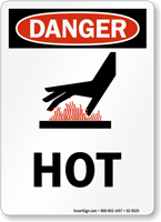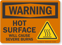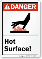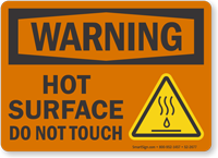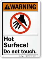 Our hot surface do not touch ANSI caution sign is appropriate for surfaces that may cause minor burns, our hot surface do not touch ANSI warning sign suits serious burn risks, and our hot danger sign is reserved for surfaces that could cause severe or fatal burns on contact.