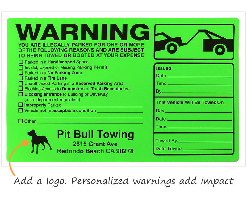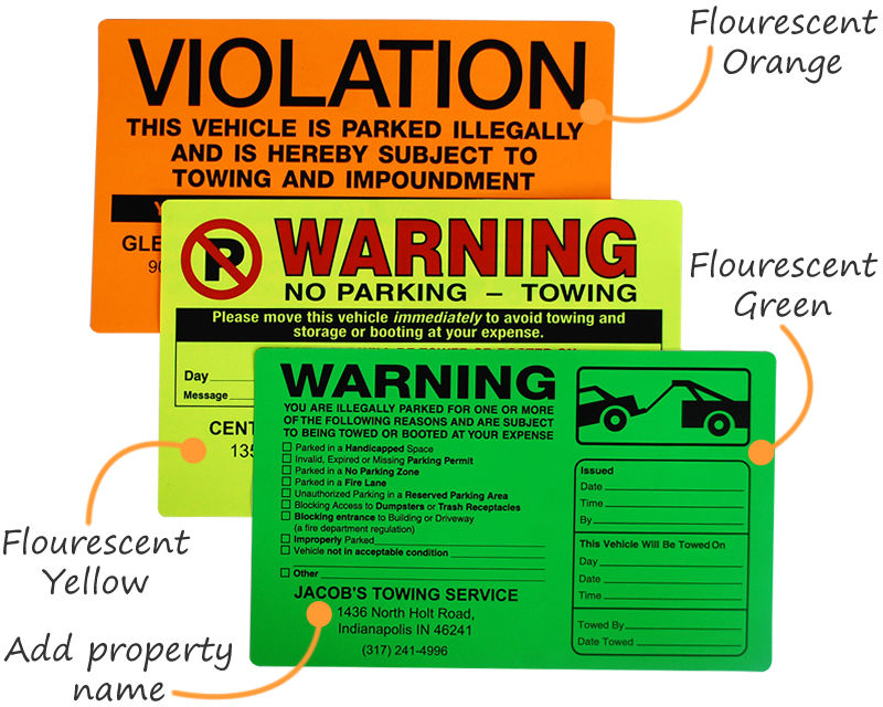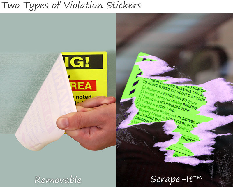 • • Hard-to-miss removable stickers provide the first warning. For the next warning, many property owners use our ScrapeIt stickers, which must be scraped off. Towing or booting is the final step.