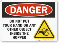 Yes, our customizable templates from our keep hands clear signs collection allow you to add a specific machine name, hazard location description, or operational instructions, and our keep hands clear of hopper and auger assembly sign is one example of our equipment-specific stock options for facilities adding point-of-use safety reminders to existing production line equipment.