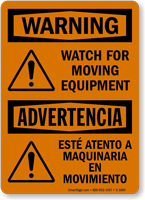 We carry moving machinery warning signs for conveyor belts, rotating equipment, automated production lines, packaging machines, and any industrial machinery with moving parts that pose an entanglement, crush, or strike hazard. Signs are available in Danger, Warning, and Caution headers in aluminum, plastic, and adhesive vinyl for wall and direct equipment mounting in factories and manufacturing facilities.