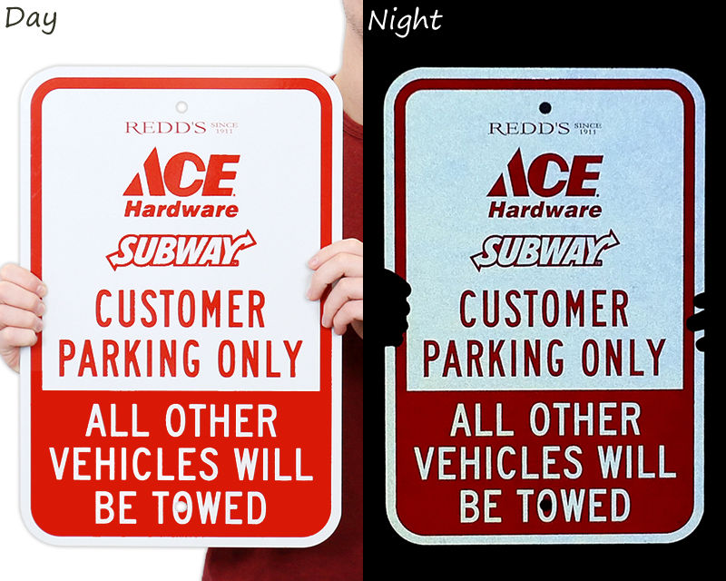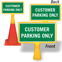 Our customer parking only signs are made of industrial-grade materials that easily last a decade or more. These rigid signs are available in standard aluminum and reflective aluminum formats in three different reflectivity grades (Diamond-Grade, Hi-Intensity, Engineer-Grade). We also offer polyethylene stencils, woven and sealed PVC cone sleeves, plastic FloorBoss, BigBoss, and ConeBoss signs.