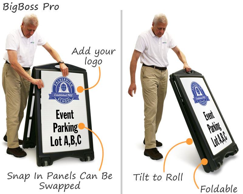 • BigBoss Premium signs fold for easy storage. Sign panels snap into place, but can be easily swapped.