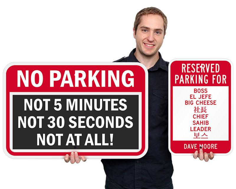 We offer a wide selection of funny parking signs for homes, offices, garages, and businesses featuring witty messages about reserved spots, unauthorized parkers, and more. They are made from the same durable aluminum as standard signs so they hold up outdoors.