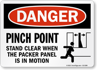 Yes, OSHA and ANSI Z535 require that machinery hazards including pinch and nip points be clearly marked with appropriate warning signs, and our pinch point signs are available in OSHA and ANSI-compliant Danger, Warning, and Caution headers with the correct color schemes and symbol pictographs to satisfy regulatory requirements at every piece of hazardous machinery.