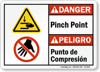Yes, OSHA and ANSI Z535 require that machinery hazards including pinch and nip points be clearly marked with appropriate warning signs, and our pinch point signs are available in OSHA and ANSI-compliant Danger, Warning, and Caution headers with the correct color schemes and symbol pictographs to satisfy regulatory requirements at every piece of hazardous machinery.