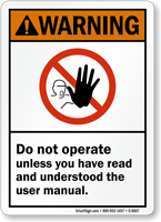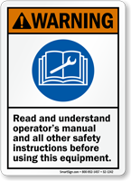 We carry read the manual and read instructions before operating signs for industrial machinery, power tools, and complex equipment. Signs are available in Caution and Warning headers in adhesive label, rigid plastic, and aluminum formats - ideal for posting directly on equipment or on nearby walls to ensure operators consult the manual before using unfamiliar or hazardous machinery.
