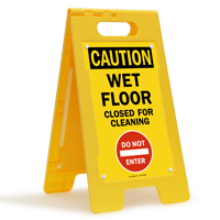 You may want to pick a wet floor sign with a graphic on and with the message conveyed in both English and Spanish languages to ensure your message reaches a wider audience. When choosing sign types, consider your usage and placement requirements to select from easy-to-store foldable standing floor signs, wet floor tags, wall signs, and cone sleeves and tops. Depending on your facility, you may even opt for barricades to restrict entry to wet floor areas.