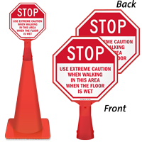 You may want to pick a wet floor sign with a graphic on and with the message conveyed in both English and Spanish languages to ensure your message reaches a wider audience. When choosing sign types, consider your usage and placement requirements to select from easy-to-store foldable standing floor signs, wet floor tags, wall signs, and cone sleeves and tops. Depending on your facility, you may even opt for barricades to restrict entry to wet floor areas.